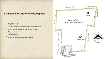 Hermoso terreno de 33 hectáreas en Valladolid sobre carretera federal Valladolid-Tikuch. El terreno cuenta con 200 metros sobre carretera. En el interior tiene un cenote cerrado y una rejollada o cenote seco. Posbilidad de habilitar energía eléctrica, las líneas de la cfe pasan sobre la carretera. Excelente opción para desarrollar con proyecto turístico.