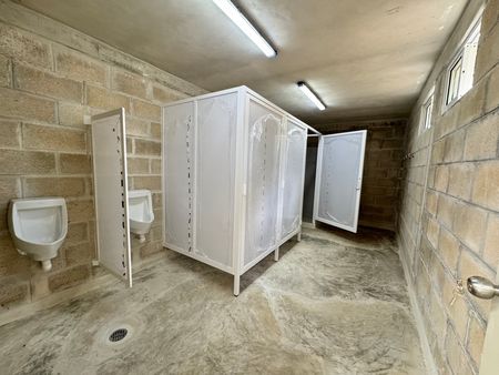 Cuenta con área de maniobras y estacionamiento, ventilación, oficinas, 3 baños y bodega.