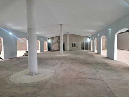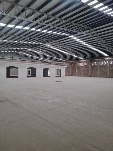 Espacios amplios con arcos estructurales, iluminación LED y columnas de soporte.