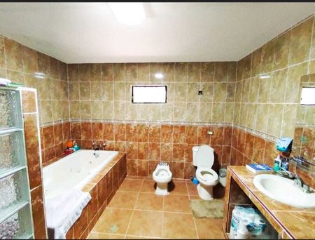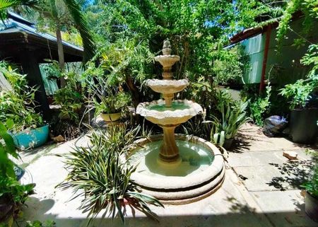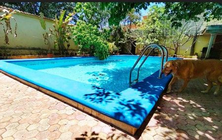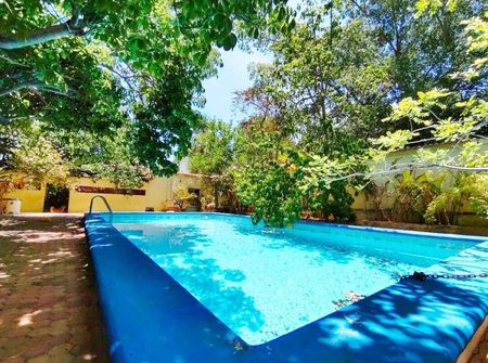 Amplia alberca, patio con cuarto de servicio, área de lavado, terraza exterior, jardín interno con fuente y arboles frutales.