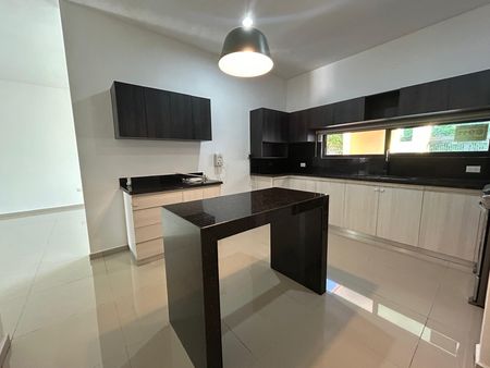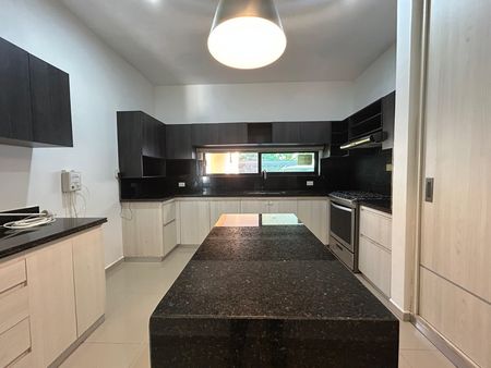 - Cocina equipada con estufa de seis quemadores a gas, campana, isla, recubrimientos de granito, alacena y gavetería superior e inferior