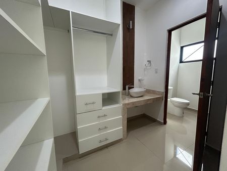- Recámara principal con: Clóset vestidor amplio con cajoneras, Baño completo con mesetas de cantera crema maya, Persianas, Aire acondicionado y Balcón