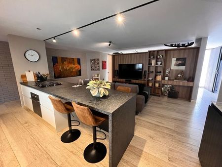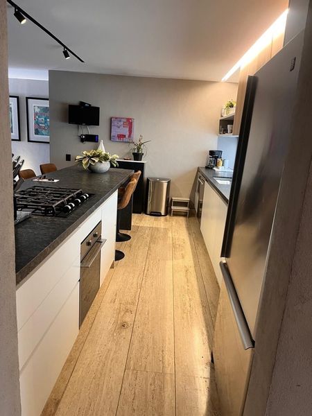 * Cocina en concepto abierto con parrilla y campana centralizadas, y alacena de piso a techo