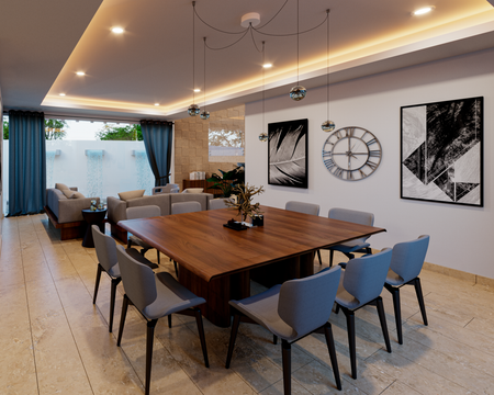 - Sala comedor con jardín interior con acceso directo a terraza y vista a la alberca