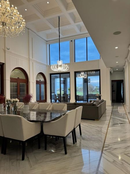 Sala comedor a doble altura con preciosas vistas al campo de golf que se une a una amplia terraza súper equipada con asador, fábrica de hielos, entre otras cosas, además de un jacuzzi para 8 personas.