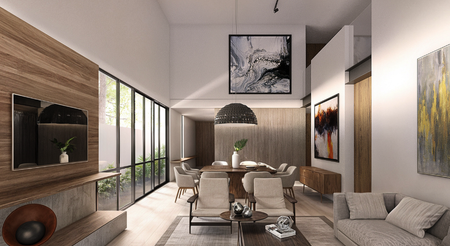 En el primer nivel, el diseño se destaca con una sala y comedor a doble altura, realzados por puertas de cancillería, lo que intensifica la entrada de luz natural, y amplifica la sensación de espacio y apertura. En contraste, el segundo nivel se centra en la privacidad y el confort, albergando la mayoría de las recámaras en un entorno cuidadosamente diseñado para ofrecer tranquilidad y bienestar.