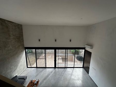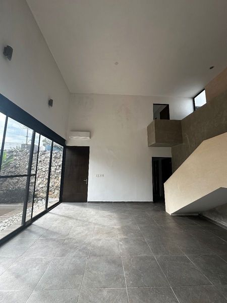 Sala y comedor doble altura abiertos con vista al jardín y la piscina , aire acondicionado de 24000 btu