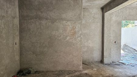 Cocina con barra de granito y muro de cantera blanca. (Sin gabinetes ni alacena).