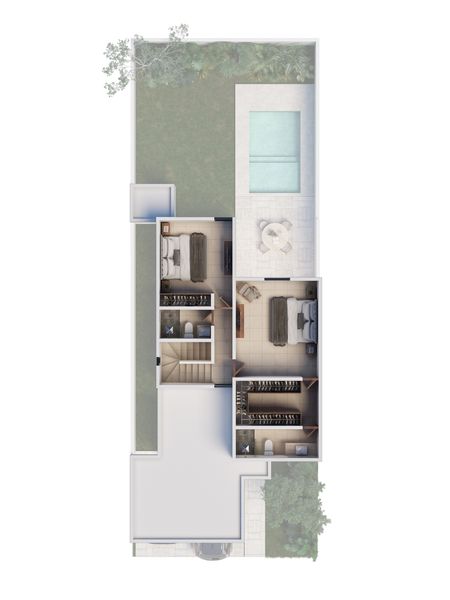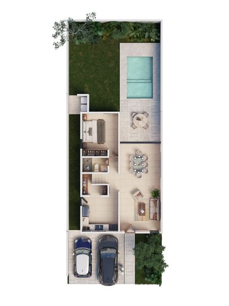 Concreto estampado, mármol y travertino, cristales templados, pasta chukum en piscina, muebles MDF en cocina (según modelo) y más detalles de gran calidad.