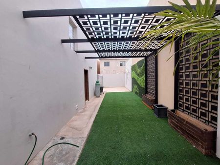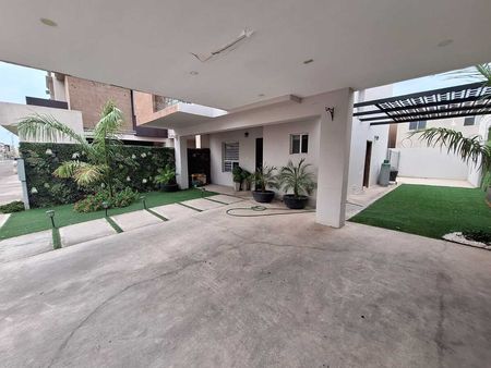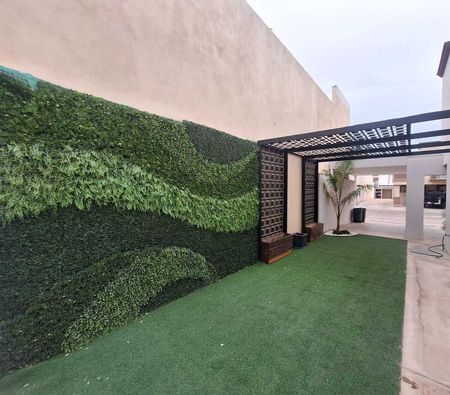 • Cochera techada, muros verdes, pasto artificial, herrería tipo celosía en jardín, asi como patio trasero techado.