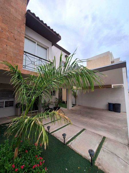 La casa cuenta con bonitos y modernos acabados, cochera techada, 3 recamaras y 2 ½ baños, asi como patio lateral y trasero.