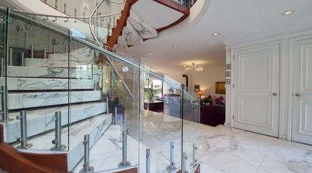 Hall de exótico mármol calacata, Moderna escalera helicoídal,