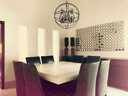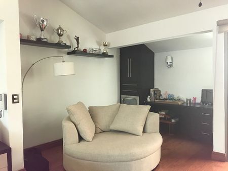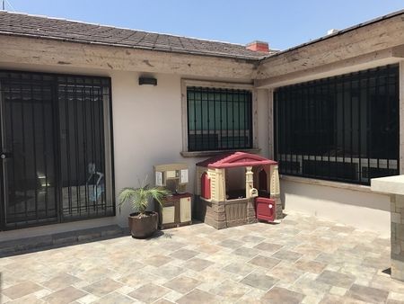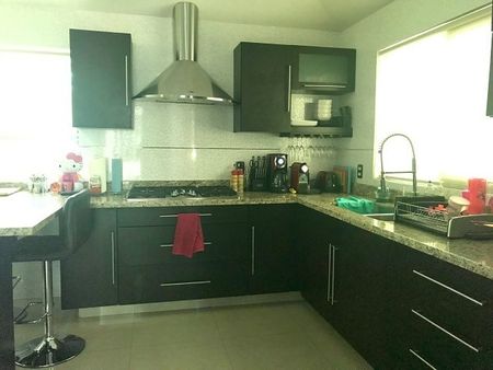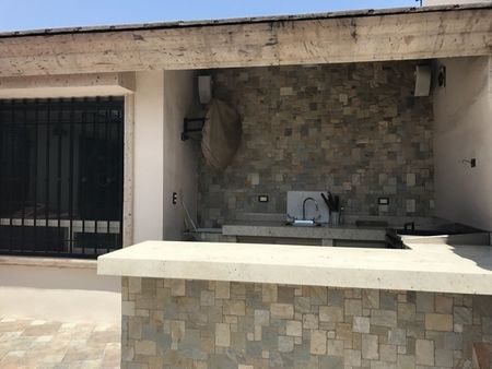 Cuenta con cochera techada para dos autos, recibidor, sala, comedor, cocina integral, baño de visitas, estancia familiar, 2 recamaras con clóset, un baño completo compartido, recamara principal muy amplia, con vestidor de piso a techo y baño completo con jacuzzi. También tiene lavandería cerrada, patio de servicio, cuarto de servicio con baño completo, patio con palapa moderna con asador.