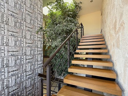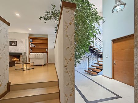 Recibidor de doble altura con un árbol decorativo que aporta vida y luz.