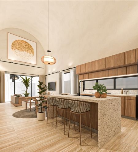 Cocina con isla y barra, se complementa a la sala/comedor a doble altura