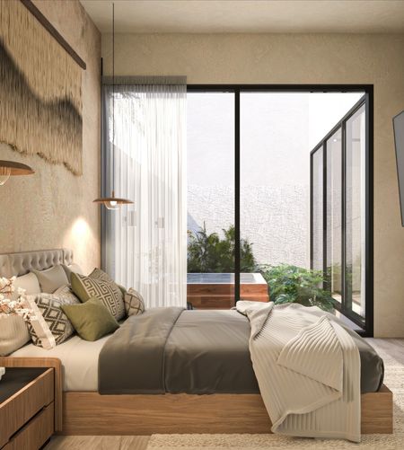 Recámara principal con vista a la terraza y la alberca, cuenta con área de clóset y