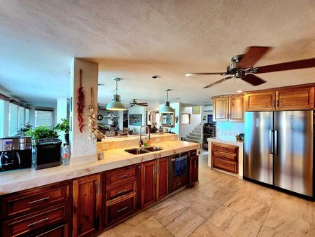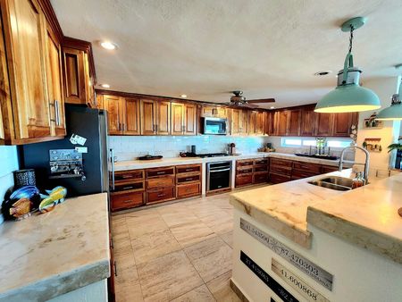 La cocina es amplia, cubiertas de piedra, gabinetes de cedro hechos a medida con 9.75 metros lineales superiores y 14.32 metros inferiores. Incluye un refrigerador–congelador inverter de 46 pulgadas, parrilla de seis quemadores a gas, horno de convección eléctrico–gas, doble tarja de acero inoxidable con triturador y lavavajillas.