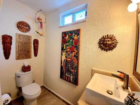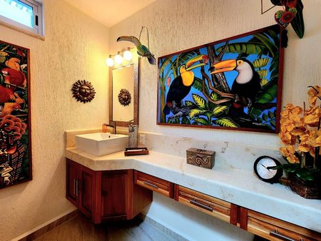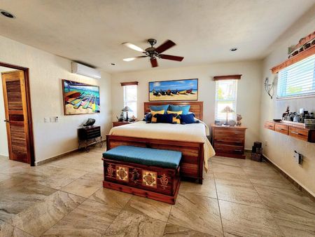 Su baño incluye cubierta de piedra, gabinetes de cedro, regadera amplia con pisos de mármol y dos ventanas que llenan de luz natural el espacio. Además, esta suite cuenta con una cocina privada con barra para dos bancos, cubiertas de piedra y gabinetes de cedro.