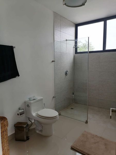 • Recámara secundaria 2, Closet de madera, baño completo, pisos de concreto pulido, regadera cuadrada anti-sarro alta presión, ventilador, aire acondicionado, cortinas.