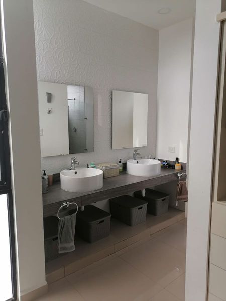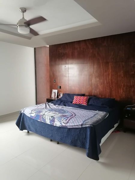 • Recámara principal, pisos de porcelanato, recubrimiento de madera en muro, cajillos de tablaroca, iluminación indirecta, ventilador, aire acondicionado, cortinas en una ventana, closet vestidor de 3.45 x 3.05m, baño propio, meseta con dos lavados, área cerrada de inodoro y regadera.