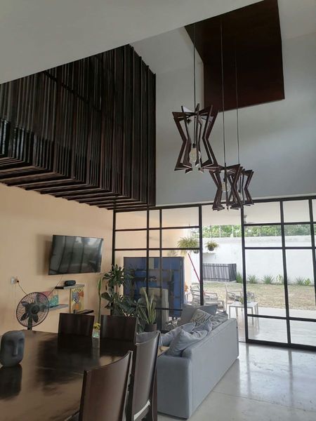 • Sala-Comedor, espacio a doble altura, puertas corredizas obscuras de cristal y aluminio, integrada a la terraza, detalles decorativos de madera, pisos de concreto pulido, muro de acabado stonecop piedra gris.