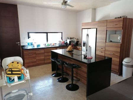 • Cocina integral unserhaus, con isla central, mesas de granito negro, gabinetes de acabado tipo madera, parrilla eléctrica, tarja doble, alacena, pisos de concreto pulido.