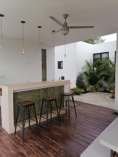 • Terraza-Bar, pisos de acabado chuckum y duela de madera, barra de bar con tarja.