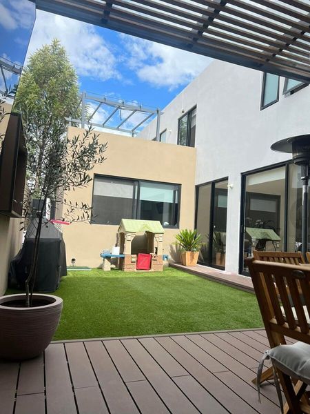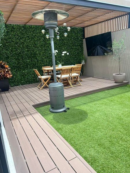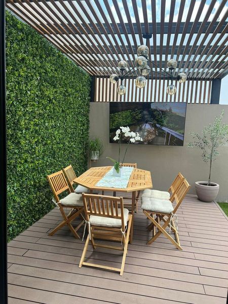 Jardín con pasto sintético premium, deck, pérgola, lámpara y muro verde