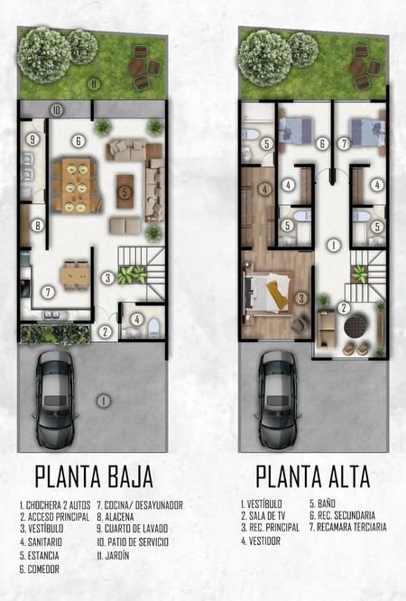 Planta baja: Estacionamiento para dos vehículos, Cocina-desayunador, alacena, cuarto de lavado, baño para visitas, sala, comedor, Jardín de 56m2 y cisterna de 3mil litros.