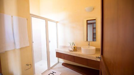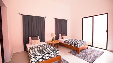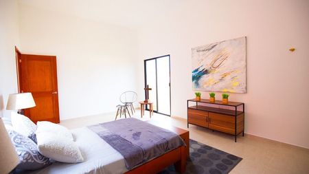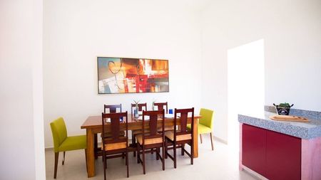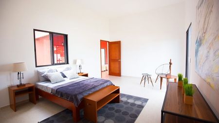 Un espacio funcional con dos recámaras que cuentan con baño y closet-vestidor cada una, sala, comedor, cocina, cochera techada para dos autos, terraza, medio baño, cuarto de lavado y área de servicios.