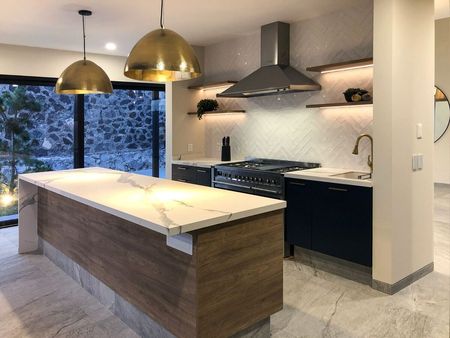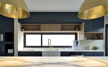 manchas y tiradores dorados complementa el diseño, una gran isla