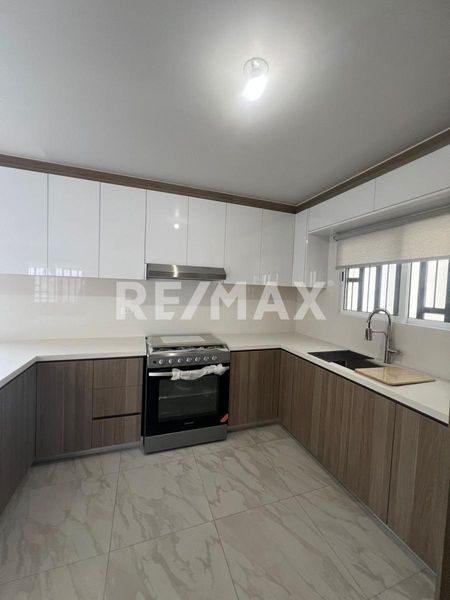 - Cocina integral con cubierta de cuarzo, gabinetes de madera con sistema push up, barra en formica, estufa y campana