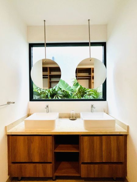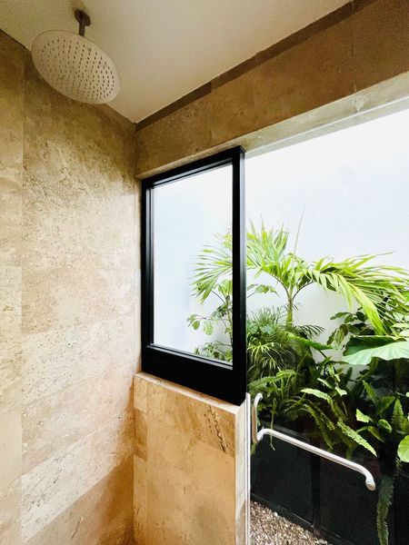 Baño con doble ovalín, regadera y vista a un jardín interior
