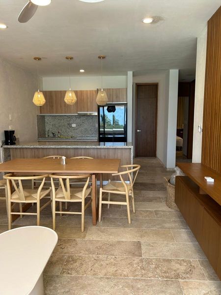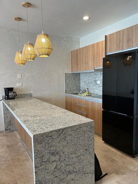 Cocina cuenta con: Barra, estufa eléctrica, refrigerador, microondas, cafetera, licuadora, juego de platos y cubiertos para 6 personas.