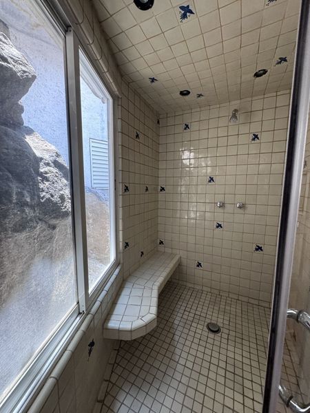 El baño tiene conexión con el peñasco, doble lavabo, secador para toallas, ducha amplia.