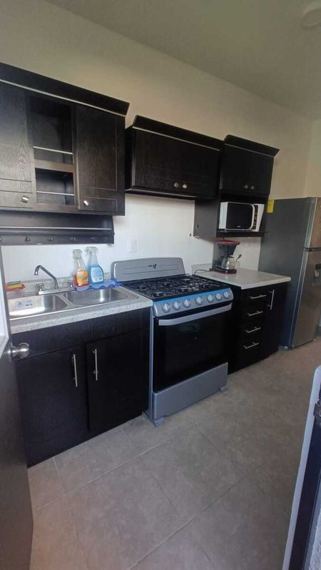 - Cocina equipada con estufa integral y refrigerador.
