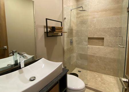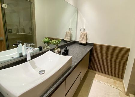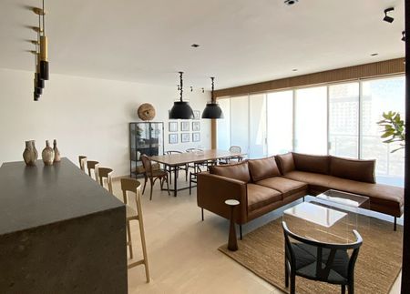Departamento con recámara principal con vestidor y baño, 2 recámara secundarias con closet cada una y baño compartido, medio baño de visitas, sala, comedor, cocina integral y terraza.
