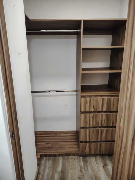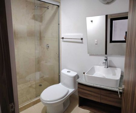 Ubicado en el nivel 2, cuenta con elevador, cocina integral, cuarto de lavado, sala comedor, balcón de 6.15m2, 2 baños completos, 2 recámaras cada una con closet. Un estacionamiento para carro pequeño ( auto elevado ), y Roof Garden común.