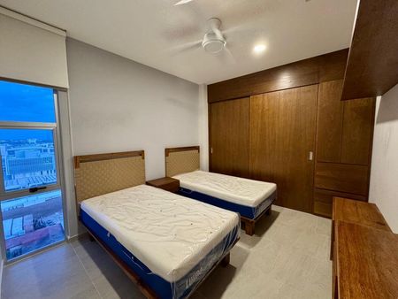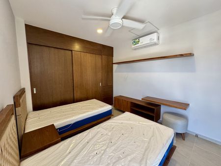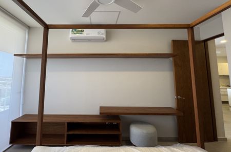 - 2 camas individuales, buro central, mueble para TV, escritorio con repisa y closet amplio de madera en recamara secundaria