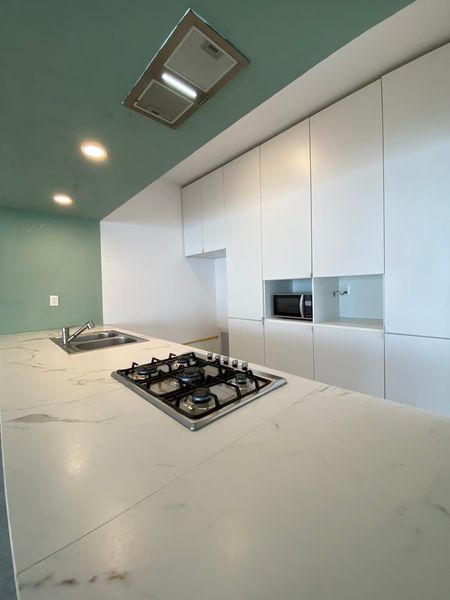 - Cocina abierta con barra desayunadora en acabado de estilo mármol.
