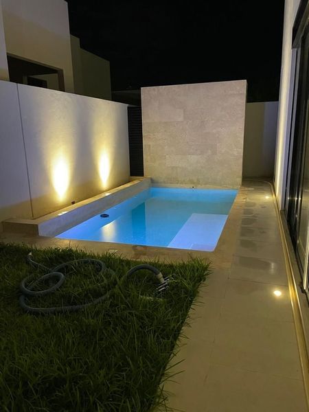 ALBERCA: Acabado chukum, luz de led subacuática, filtro, bomba y baño completo exterior.