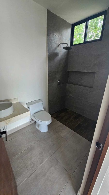 Muros de block a base de concreto, losa de vigueta y bovedilla, con acabados interiores en yeso y pisos de ceramico de 45 x 60, acabados en plafones con yeso, mesetas con marmol crema maya y granito en cocina, puertas de tambor en acabado tzalam, cocina con estufa y tarja con llave modelo urrea, llaves y monomandos modelo urrea, acabados exteriores a base de mortero cemento y polvo, acabados en plafones con calcreto e impermeabilizante en azoteas.