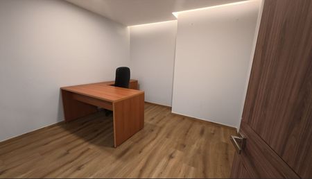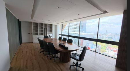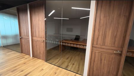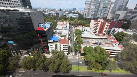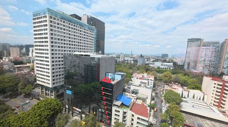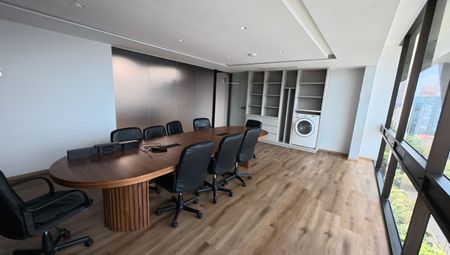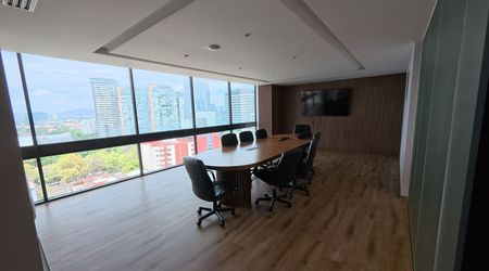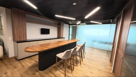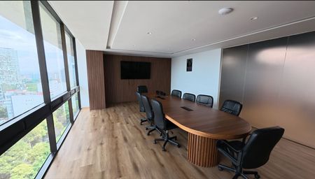 Distribuido de las siguiente forma Recepción área abierta, para 10 colaboradores, tres privados, barra de café, una sala de juntas grande 15 personas con vista espectacular