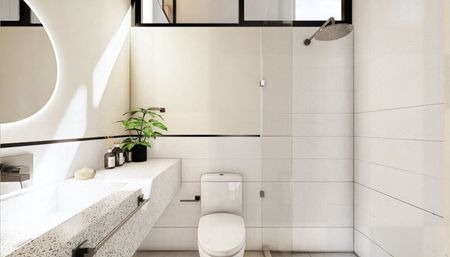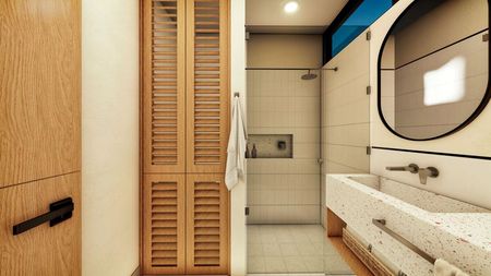 - Baños con accesorios marca Helvex, recubrimientos cerámicos, fijos de cristal templado y mesetas de terrazo