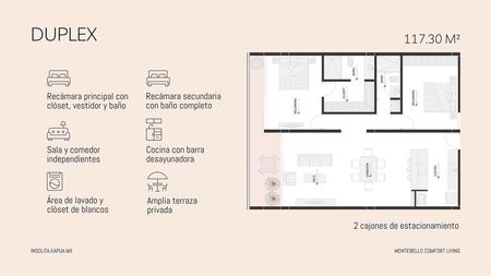 Este modelo duplex de 117.30 m², completamente equipado, cuenta con una recámara principal con vestidor y baño, una recámara secundaria con baño, sala comedor, terraza privada, cocina con barra, área de lavado y dos cajones de estacionamiento. Diseñado con acabados de alta calidad, incluye mesetas de cocina en granito Vía Láctea, mármol Santo Tomás en baños, pisos de mármol Fiorito Travertino en áreas generales y cerámicos San Gabriel en baños, además de aire acondicionado, abanicos, mosquiteros, persianas, parrilla eléctrica y calentador de agua.