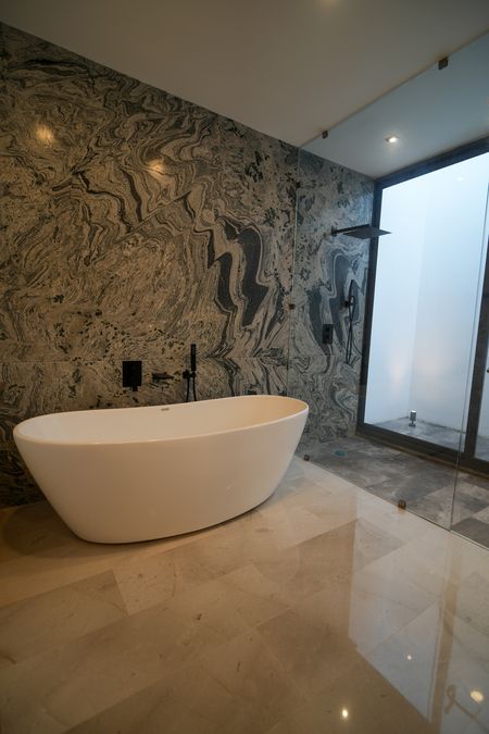• Alberca con recubrimiento de mármol, filtrado e iluminación WiFi