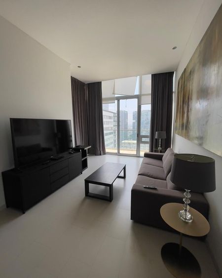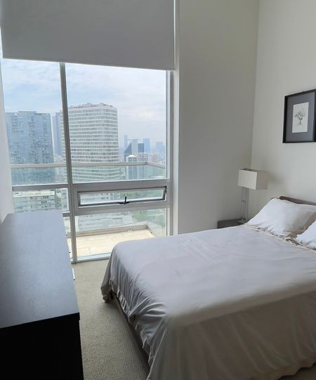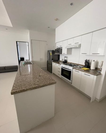 El departamento cuenta con cerradura inteligente, la estancia para comedor y sala con amplios ventanales y vista exterior, techos de doble altura. Cocina abierta totalmente modificada y mejorada, barra al centro tipo isla, estantería extra, alacena con puerta, área para centro de lavado. Dos recamaras con clóset color nude y puertas corredizas y pisos de madera, comparten un baño completo con cancel.