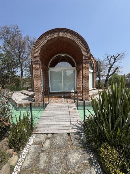 Mas al fondo se encuentra un pabellón de forma octagonal de 350m2 con bóveda catalana y linternilla, para meditar y encontrarse uno mismo. O bien puede fungir con salón de eventos y usos múltiples rodeado de fuente y espejo de agua que construye un ambiente de paz perimetralmente.