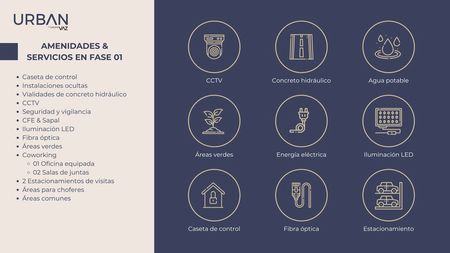 Caseta de control, vialidades de concreto hidráulico, seguridad 24/7, iluminación LED, fibra óptica, CCTV y más.