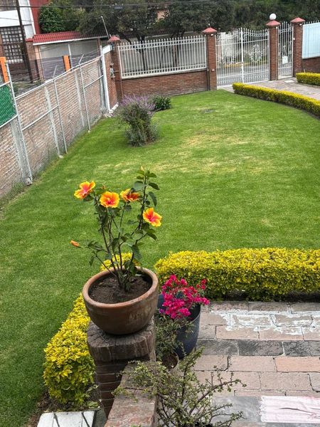 Impresionante jardin y sendero adoquinado. El terreno es ligeramente ascendente. Trazo ingles tudor de raices monumentales con encanto. Tabique emparillado aparente, techos inclinados con volumenes de doble a triple altura con ventanales tipo bay window reticulados.